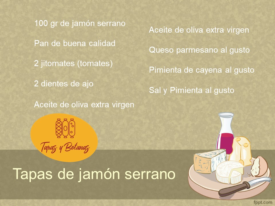 Se unta la salsa en cada rebanada y posteriormente se les pone una porción de jamón serrano a cada una que abarque la totalidad de la rebanada de pan.